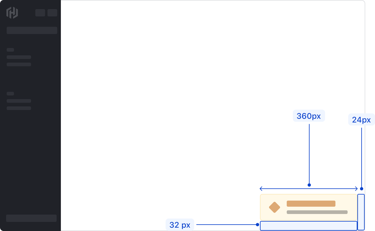 Toasts appear in the bottom right corner of the viewport with a margin of 32px from the bottom and 24px from the right side of the viewport. If a warning or error is contextual to a specific UI feature, such as a form, directly associate an Alert to that feature instead of using a Toast.